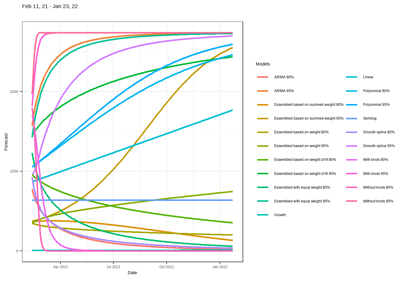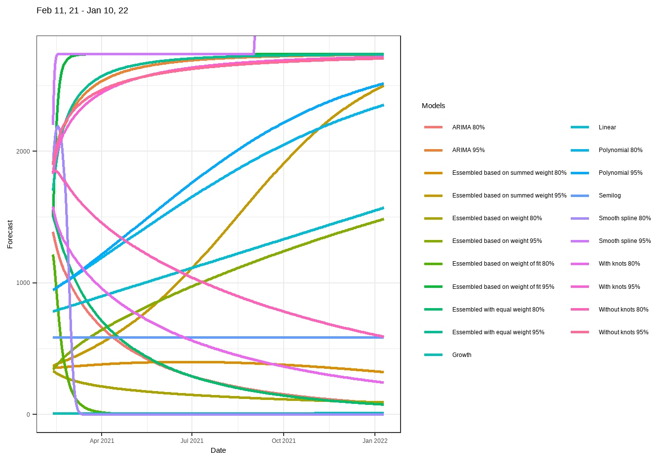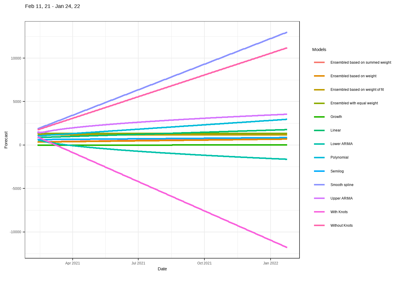Days_full <- DynamicForecast(date = date, series = series, BREAKS = BREAKS, MaximumDate = "2021-02-10", Trend = "Day", Length = 0, Type = "Integer")