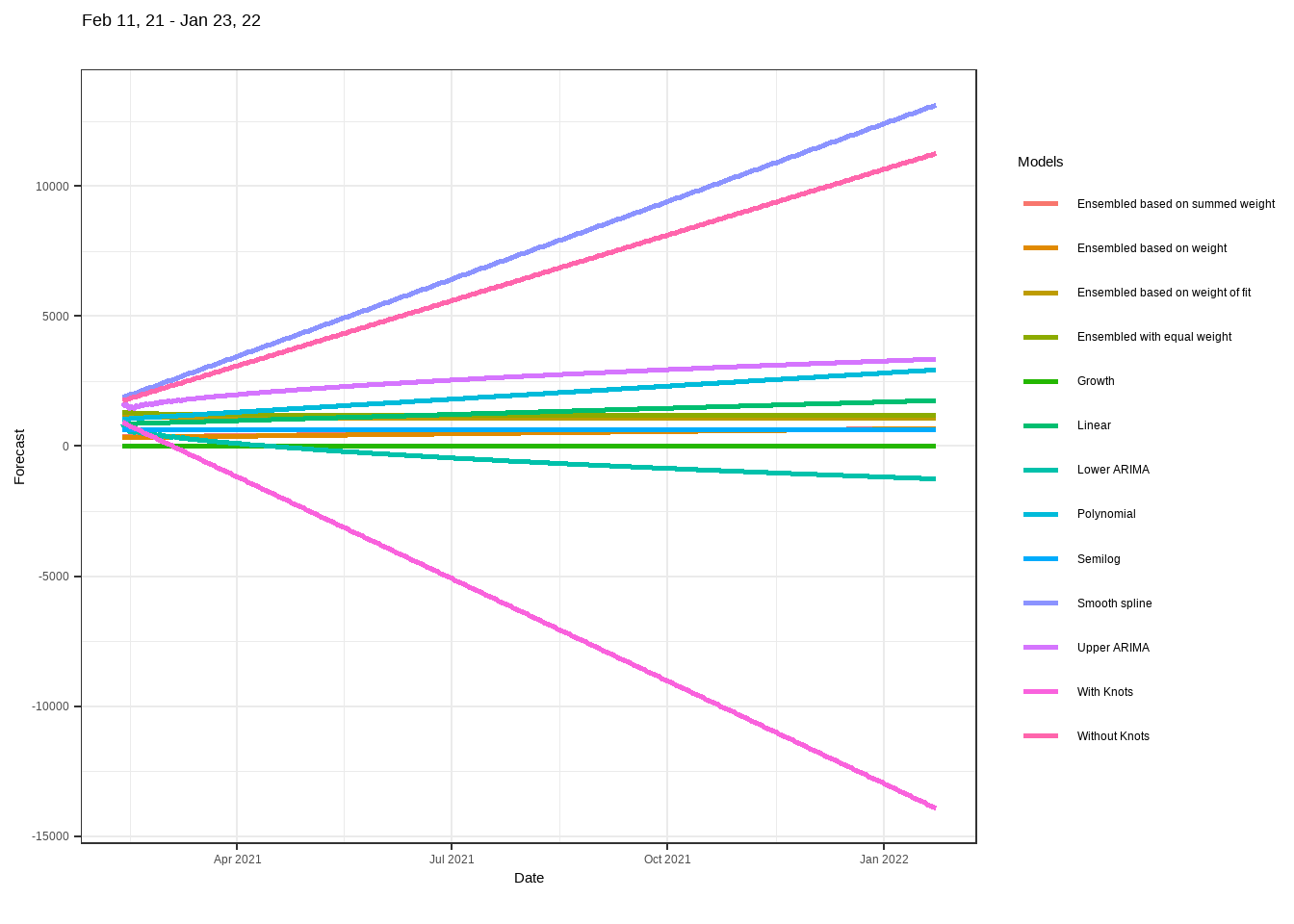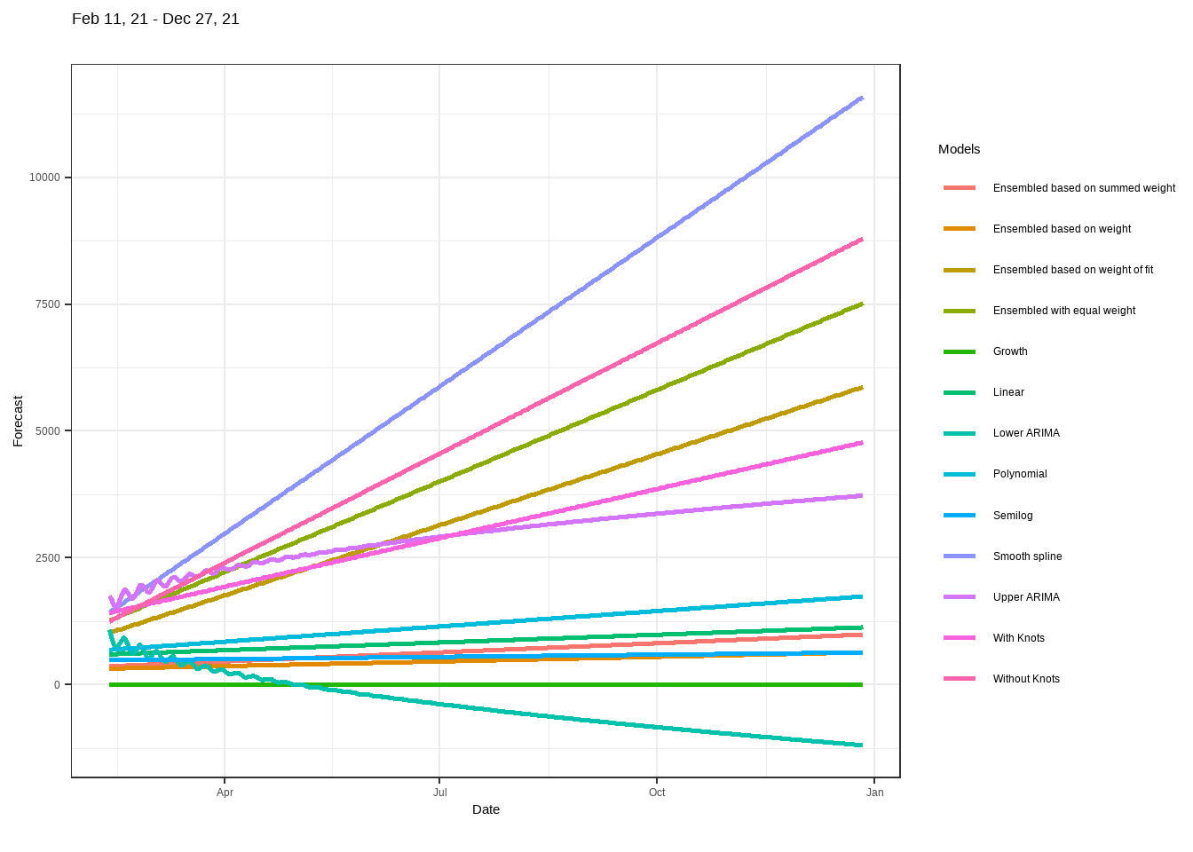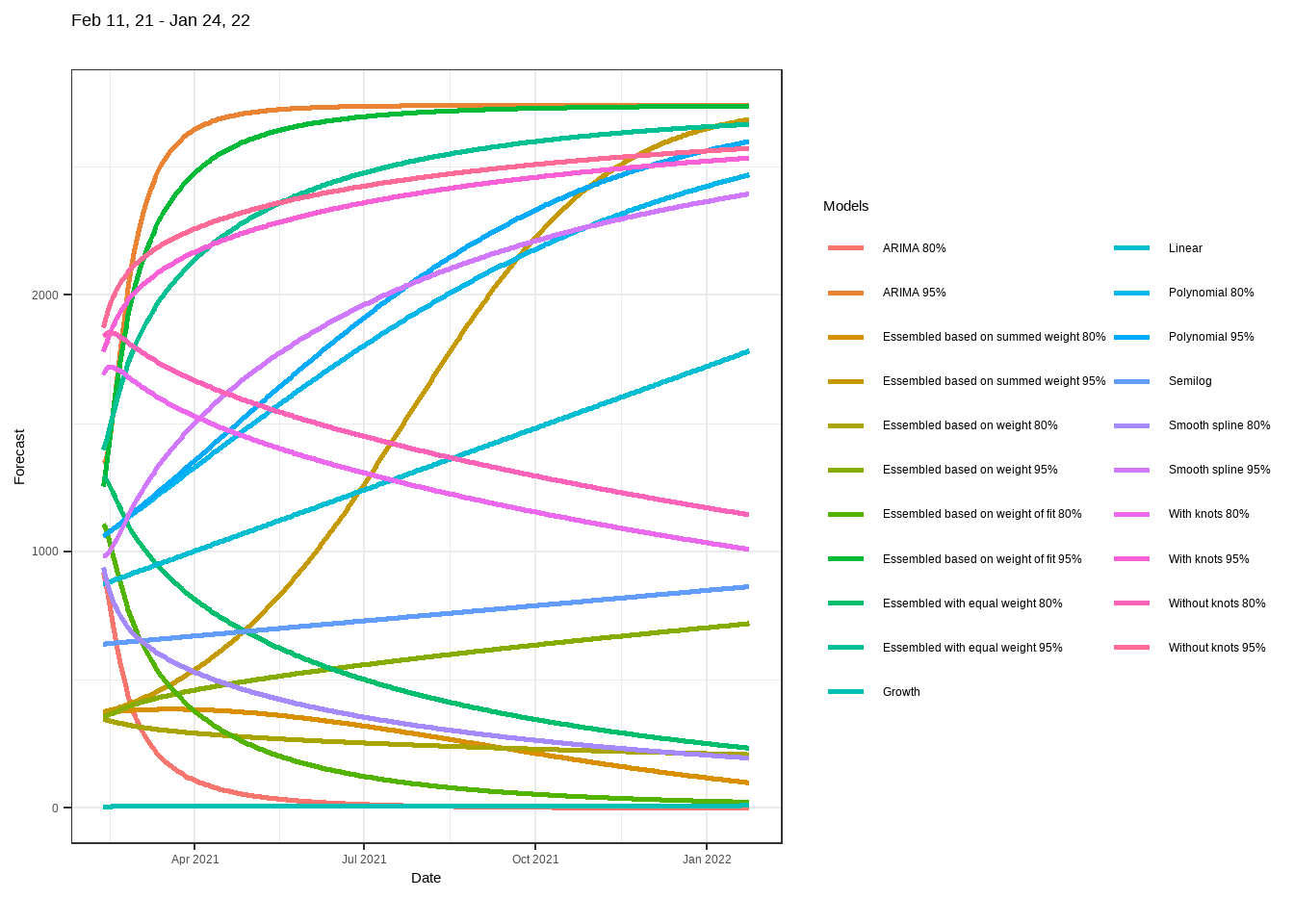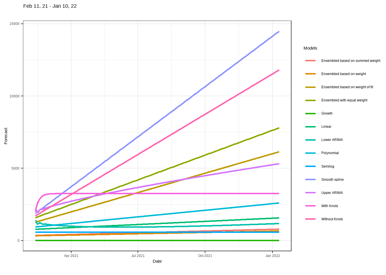 Days_full <- DynamicForecast(date = date, series = series, BREAKS = BREAKS, MaximumDate = "2021-02-10", Trend = "Day", Length = 0, Type = "Integer")