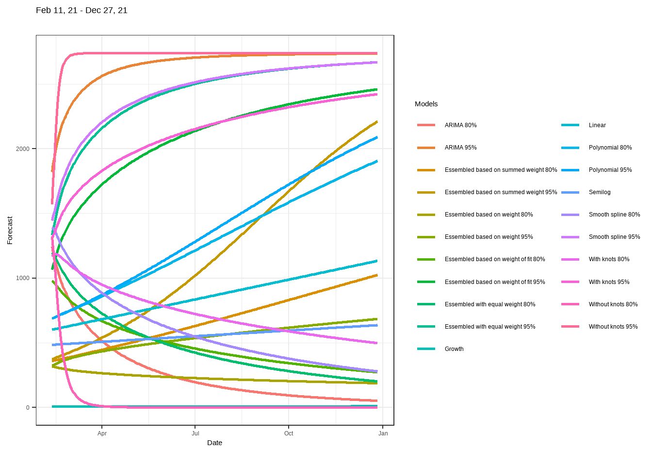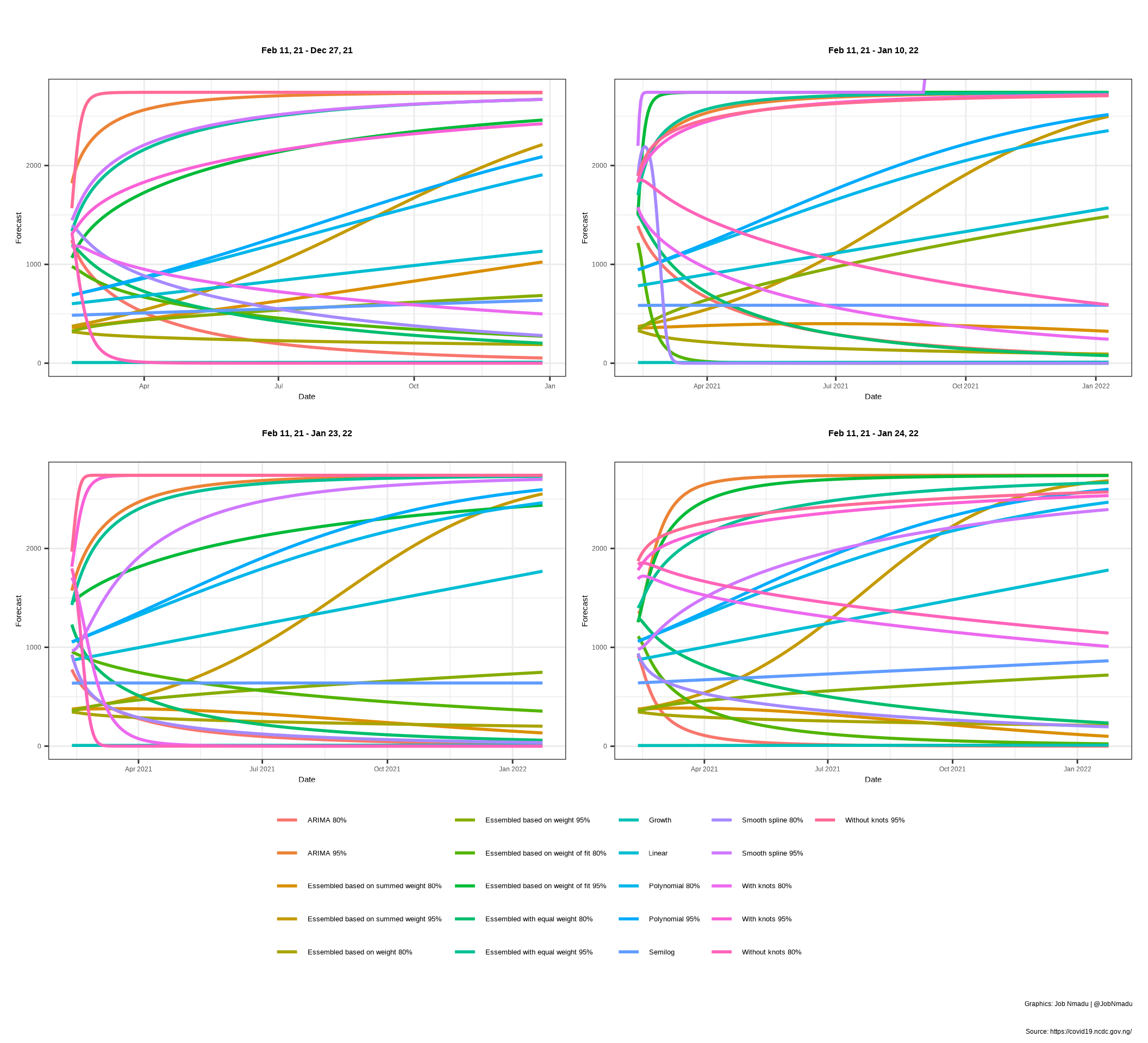 Thereafter, daily summaries, trend of the observed cases and possible future path through modeling and forecasting were made once the data is updated. The forecast lenght was usually the total length of the observed data which entually led to the concept of equal length forecast. It was in this wise that it was observed that the changes in forecast with just a additional day’s data were quite alarming. Hence there was need to have a way of quickly comparing time-variant forecasts. After careful consideration, the concept was synthesized into the Dyn4cast package (Nmadu 2020). Presently, the package has five functions.