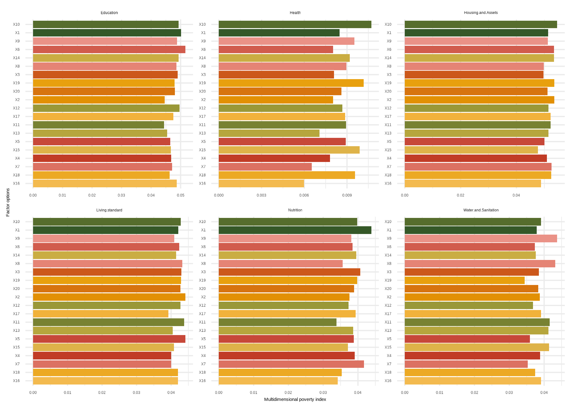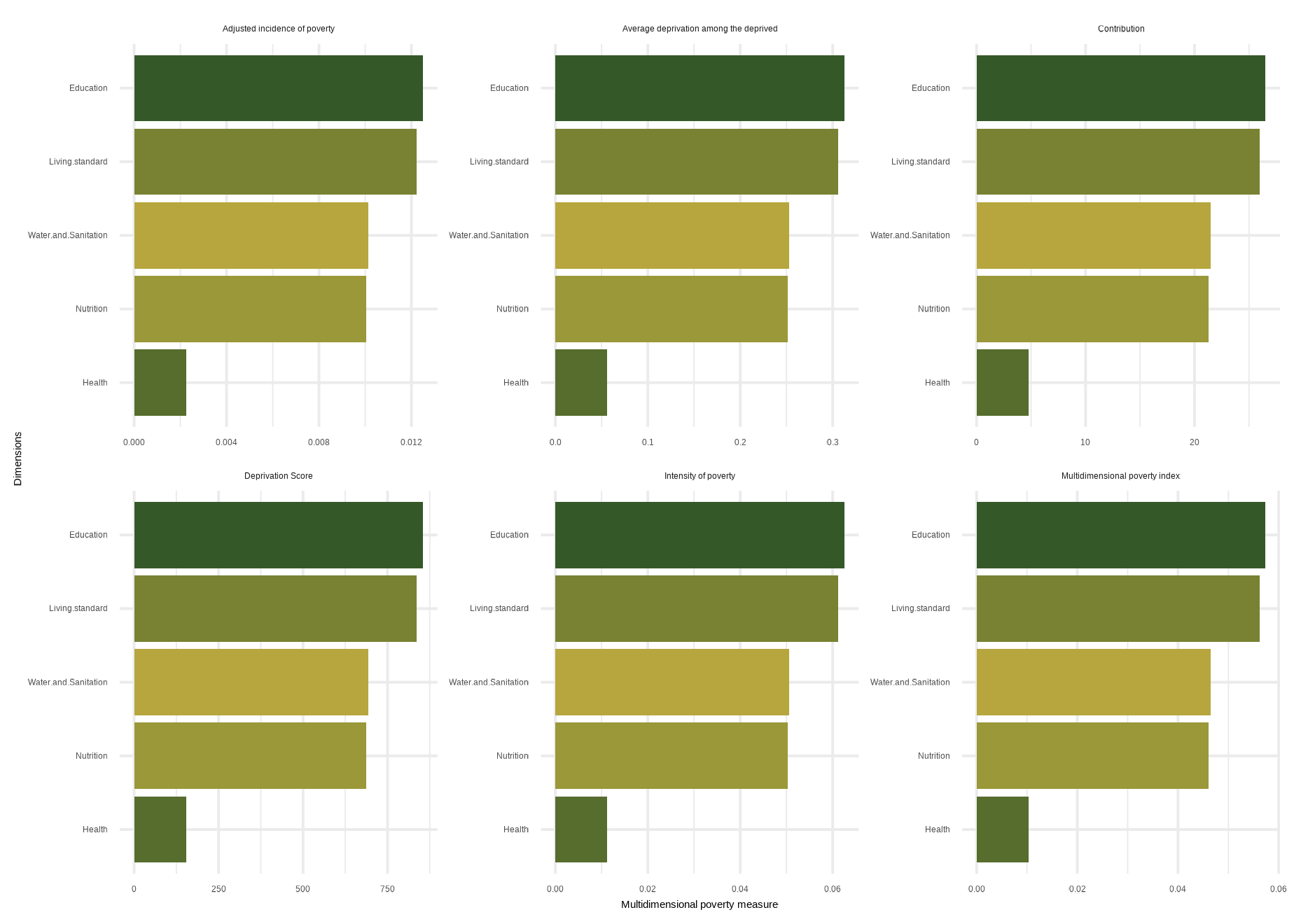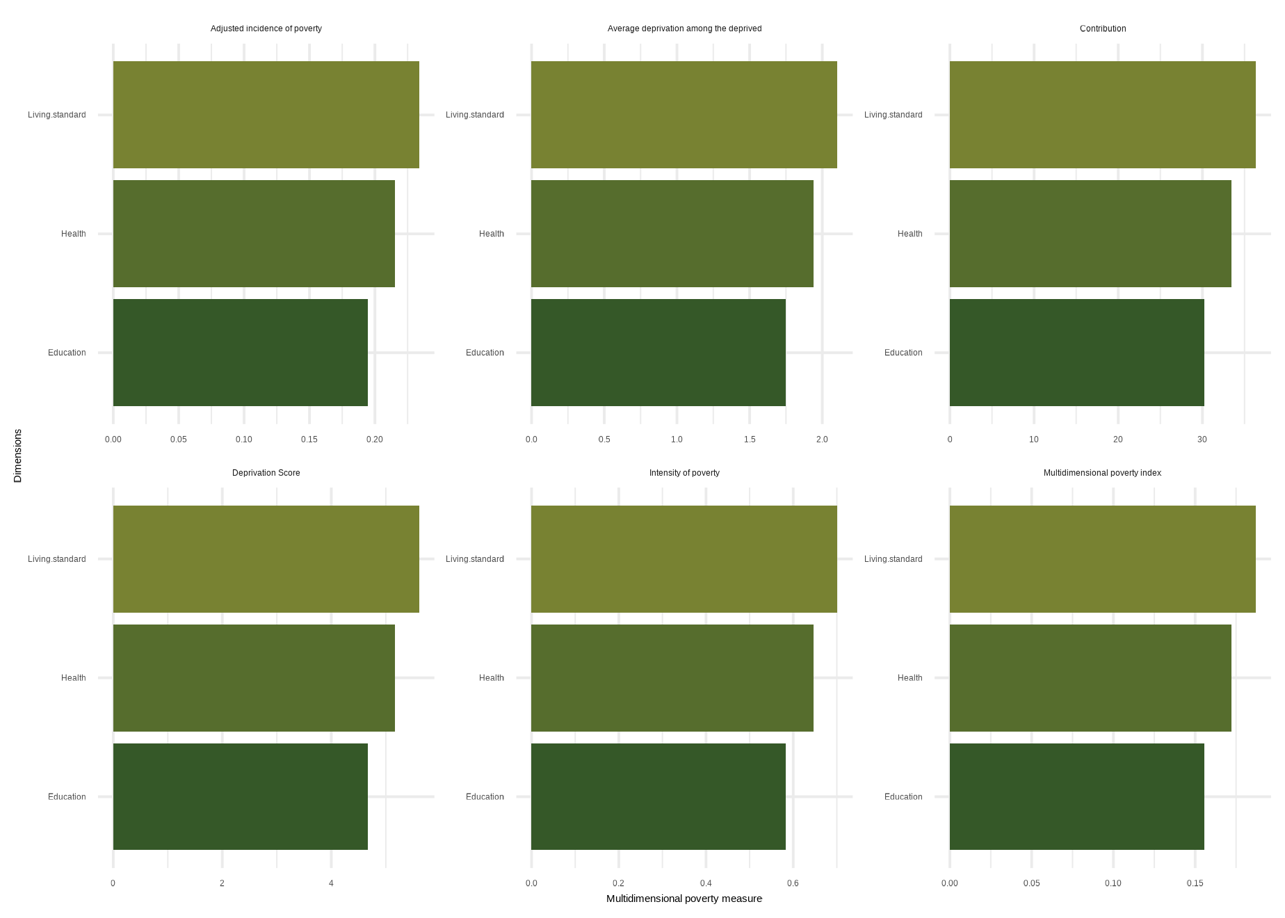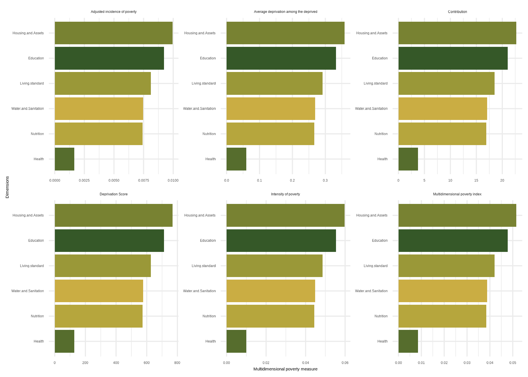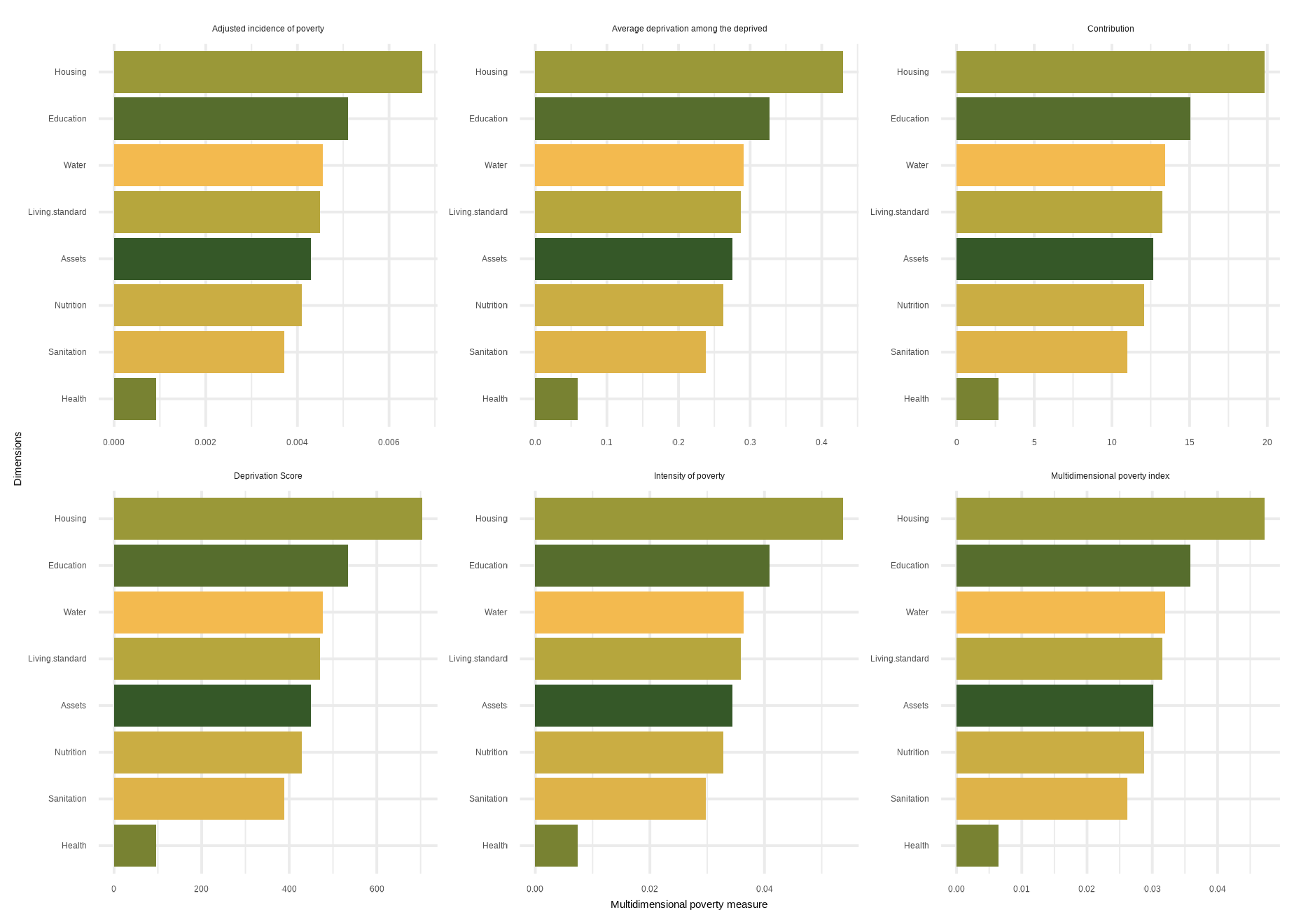 mdpi( data, dm, Bar = 0.4, id_addn = NULL, Factor = NULL, plots = NULL, id = c(“Health”, “Education”, “Living standard”), id_add = “Social security”, id_add1 = “Employment and Income”)